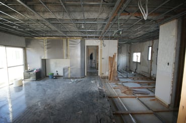 写真のは3階建ての鉄骨造メゾンオーナーのリフォーム案件です。1・2階賃貸で、3階の130㎡位の1フロアのオーナールームを75㎡と55㎡に2分割するリフォーム工事の時の写真です。