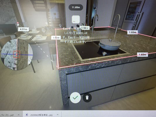 営業マンに聞くまでもなく、壁の高さ・窓の大きさも分かるし、気になる場所の距離も測れる!いや、ホント凄いなコレ。こういったシステムの進化ってあっという間なんですね。