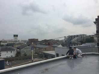 原因を一つ一つ潰していき、解決に導くのことになります。今回は、屋上の屋根の立ち上がり部分を覆っている笠木(写真で2人が掴んでいる白いもの)のシーリング部分が怪しいのではないかという話になりました。